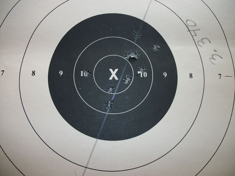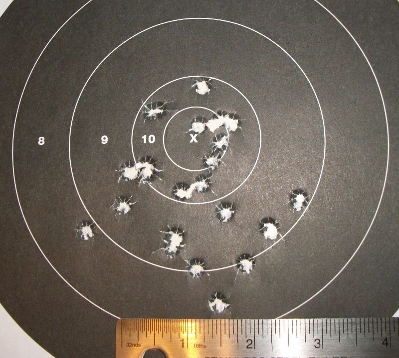 I mounted a long eye relief scope on my sporter to use in cast bullet matches using the Kraghaus mount. Today I hit the range and got it sighted in at 100 yards. Shooting 185 grain spitzers that Madsenshooter cast for me, I put 25 on the paper with great results. The lower shots were while sighting it in, and I pulled a couple... but I have at least 14 shots in a 2 inch group around the bull! Woohoo!