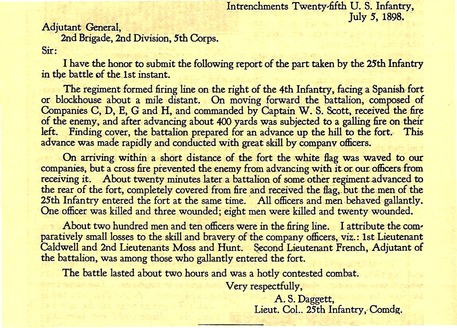 I have read an account by a Northern Michigan N.G. Volunteer, who witnessed the storming of El Chaney (Santiago, Cuba) by Black U. S. Regular Infantry. "It was the bravest thing he ever saw"! They were the first into that fortification and captured the Spanish Colors, only to have them taken away by the officer of a white regiment, who wanted the 'Honor' for his men.