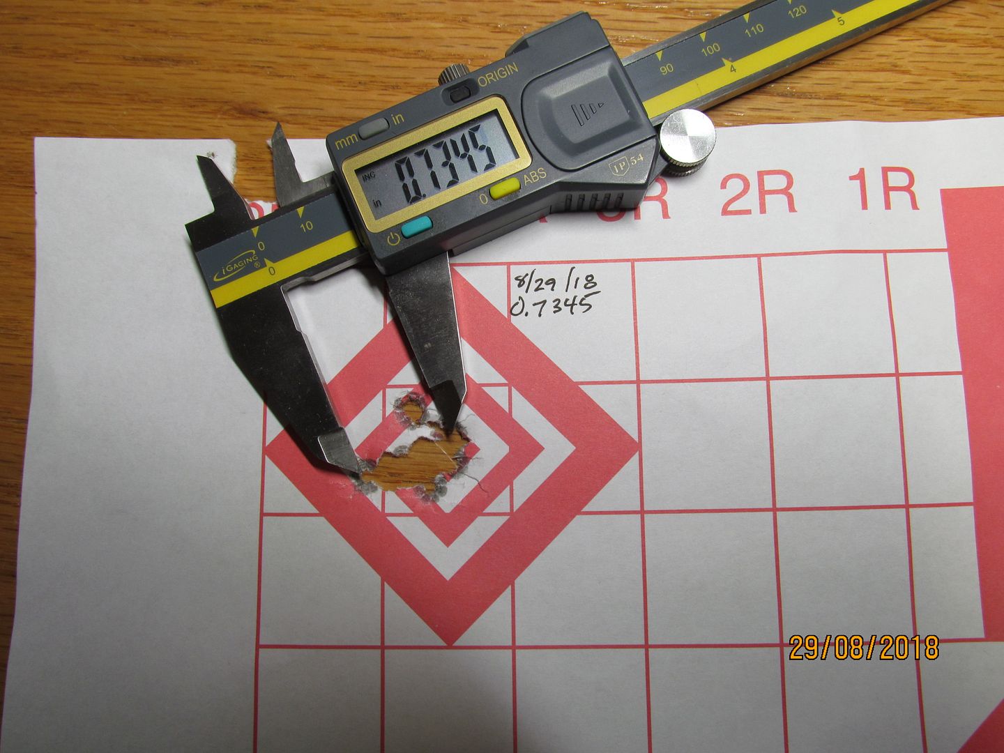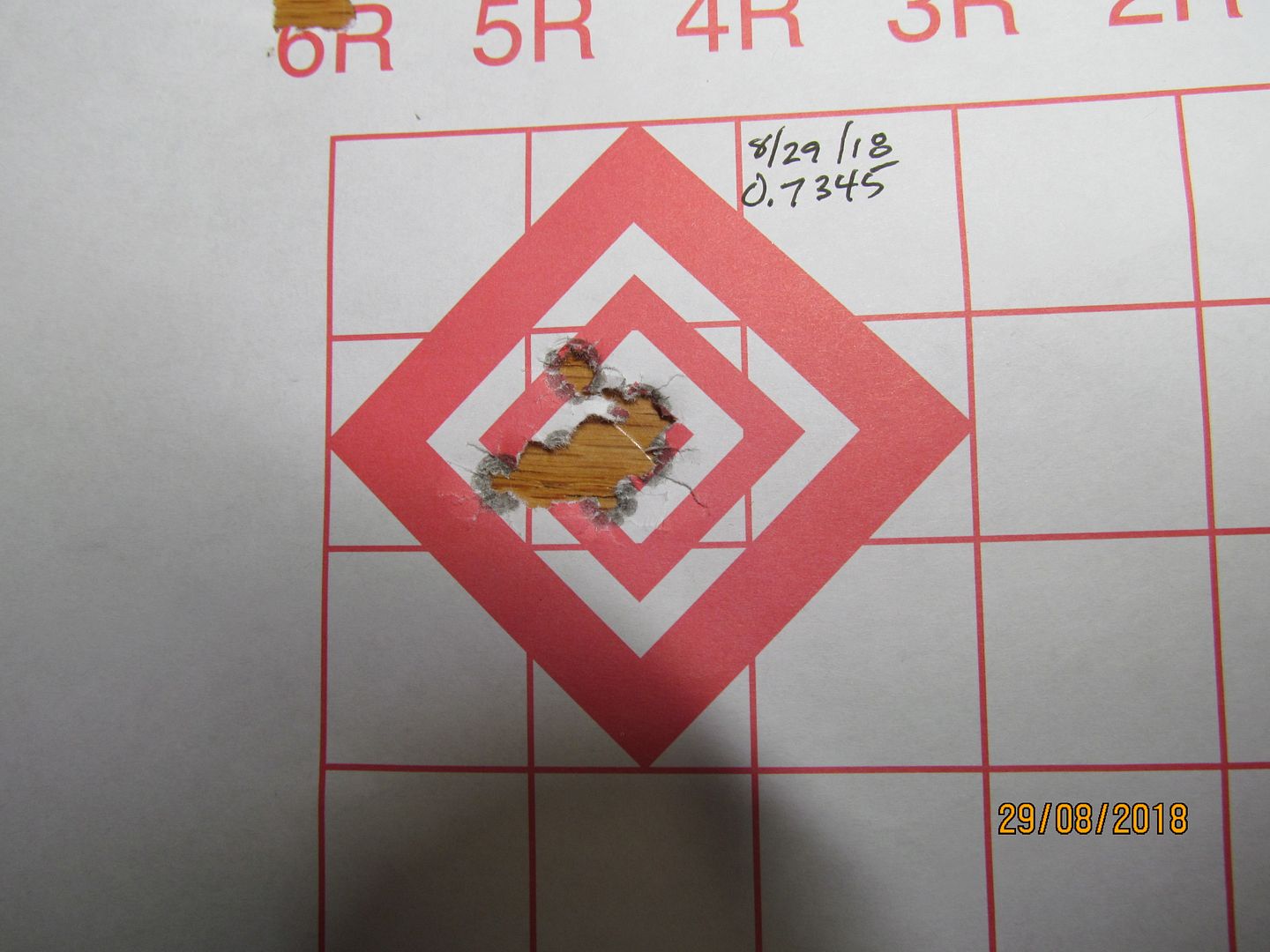 Ammo used for practice today is thrice loaded DAG berdan primed brass with Tula berdan primers over 45 gr of Varget pushing a 136gr FB bullet. This bullet is the NEZ secret projectile talked about last year and special ordered. 10 rnd group shot at 100 yds into 0.7345 ". Temp 84 deg f, humidity high. Someday I am going to try this off a concrete bench and see if my groups tighten up a bit.