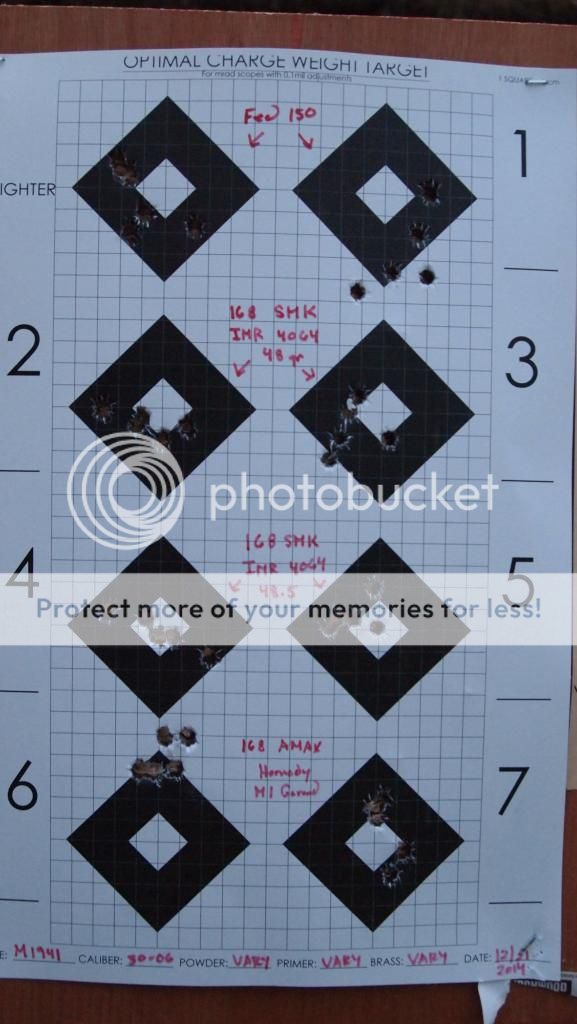 Four different loads. Fed 150 cannon fodder, couple of IMR 4064 reloads, and Hornady 168 AMAX M1 Garand load...