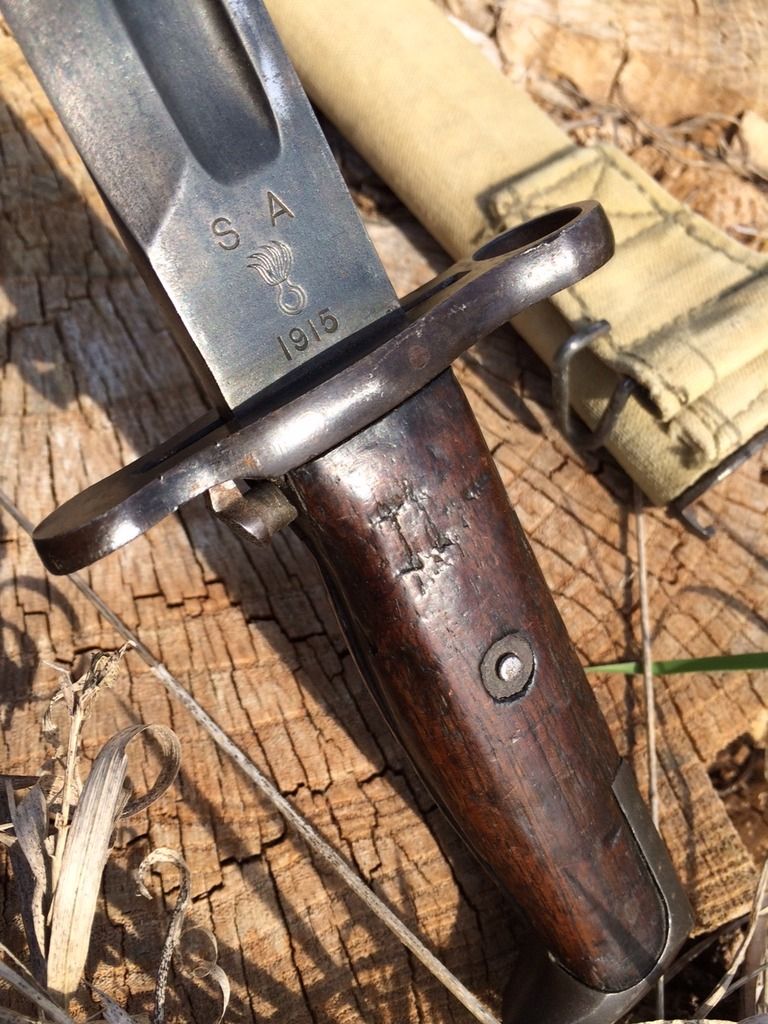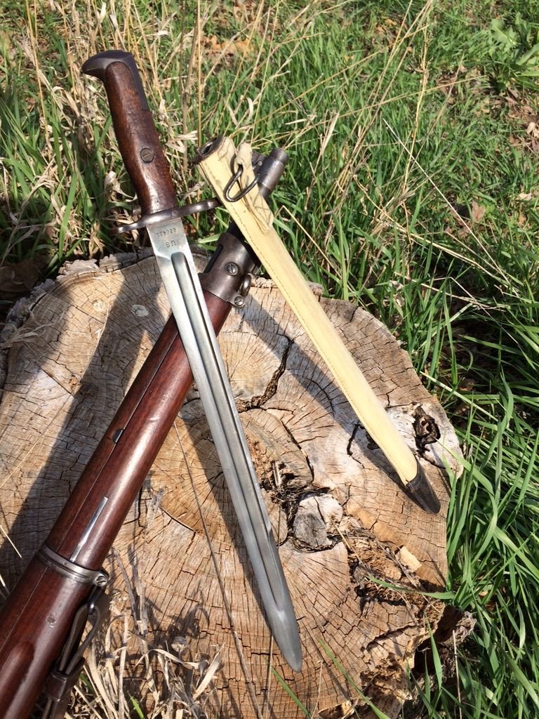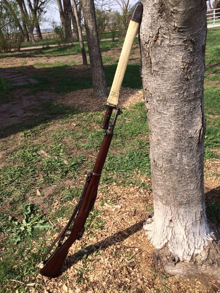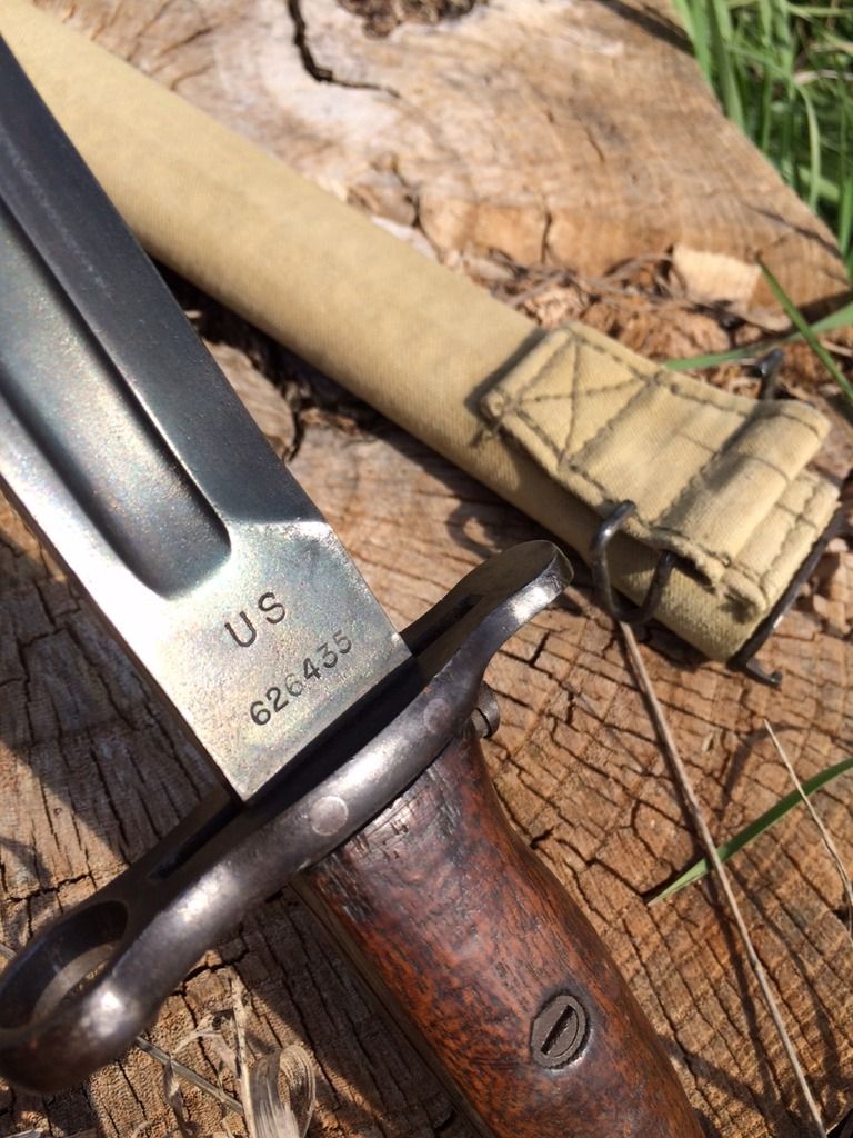 With it of course is a 1905 bayonet with a 1915 date. The scabbard is of the type with the cotton duct cloth on it. Some say that it's the type of scabbard that The Corps issued to their men during WWII, but I know nothing of that and so can't say. The front sight looks original and not replaced. Besides the bolt, I replaced the rear sight slide tightening knob with another that was new and of the same type. The original on it was worn and so couldn't tighten against the rear sight leaf so I replaced it with a new one of the exact same type that locks the slide into place. Other than that, the rifle is just the way that I got it. The front sling swivel is the split type. It's a nice representative piece of the type that went off to war in 1917 and 1918 and appears to be in all original form.