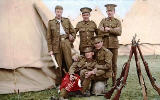 The soldier, Private Perry, with the white rag around his neck was killed by an artillery shell just moments after this photo was taken at the front.