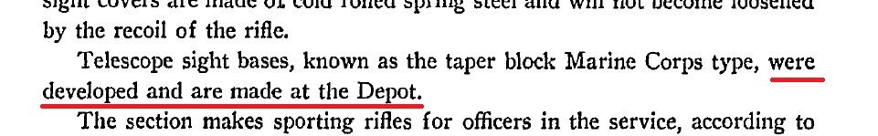 The "Marine Springfield Mount" is a block that is required to mount an A5 scope on 7.2" centers. All 03 rifles with scopes mounted on 7.2" centers use them to this day. They are not particular to the Corps, and every commercial gunsmith that mounted an A5 scope on 7.2" centers used those bases. If I recall, the WRA drawing of this base is dated 1925 or so.Everyone has always assumed the Mann Neidner was the Marine blocks, when Winchester had their own design they named Marine. The whole confusion of all this, is a play on words.