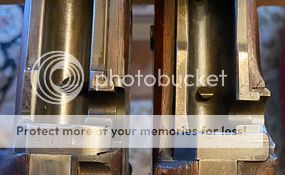 The receiver was cut to make room for the 1866 rear sight, which was left whole. Here a bit of the barrel thread was left exposed. Strong squared off threads.